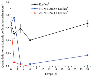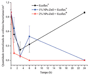 ![]() Figura 2. Curva de morte obtida com os filmes poliméricos de Ecoflex® aditivados com 1 e 2% (m/m) de NPs-ZnO e para o filme polimérico de Ecoflex® puro frente a bactéria S. aureus