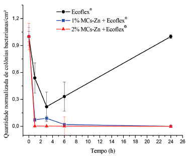 ![]() Figura 4. Curva de morte obtida com os filmes poliméricos de Ecoflex® aditivados com 1 e 2% (m/m) de MCs-Zn e para o filme polimérico de Ecoflex® puro frente a bactéria S. aureus