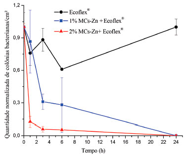 É possível constatar que tanto para as NPs-ZnO quanto para as MCs-Zn os maiores halos de inibiçao sao observados para a bactéria gram-positiva S. aureus, resultado já esperado, pois as células bacterianas gram-positivas possuem apenas uma camada exterior como membrana plasmática, o que facilita a penetraçao de compostos antimicrobianos e a interaçao com o citoplasma bacteriano, tornando as gram-positivas mais susceptíveis quando comparadas as gram-negativas. As bactérias gram-negativas possuem uma membrana adicional, formando uma estrutura de bicamada fosfolipídica mais resistente que aumenta a proteçao citoplasmática de agentes antimicrobianos, a exemplo da bactéria E. coli.36 A maior resistência da bactéria E. coli, em relaçao a S. aureus, pode também ser possivelmente atribuída à diferença na polaridade da membrana celular, uma vez que a membrana da S. aureus tem carga negativa menor quando comparada à membrana da E. coli.37 Com diferenças menores de carga é possível maiores fluxos de penetraçao de radicais livres, tais como radicais hidroxila, superóxido e íons peróxido, para o citoplasma. Este efeito conduz com maior facilidade a morte celular das bactérias S. aureus em relaçao a E. coli.38 Além disso, vários fatores podem afetar a atividade antimicrobiana, entre os quais o tamanho das nanopartículas e, desta forma, a área de superfície, bem como a sua atividade em sinergia com outros agentes antimicrobianos.4 Quando comparados os diferentes aditivos antimicrobianos frente à mesma bactéria, observou-se com análises estatísticas, que nao houve diferença significativa entre ambos. Ou seja, um efeito antimicrobiano muito semelhante é observado para as NPs-ZnO e MCs-Zn quando estudada a mesma estirpe bacteriana. Atividade antimicrobiana dos filmes poliméricos As Figuras 2 e 3 apresentam os resultados microbiológicos obtidos com curvas de morte, para as bactérias S. aureus e E. coli, respectivamente, para os filmes poliméricos de Ecoflex® aditivados com 1 e 2% (m/m) de NPs-ZnO. O filme polimérico de Ecoflex® puro também foi submetido a este ensaio microbiológico.