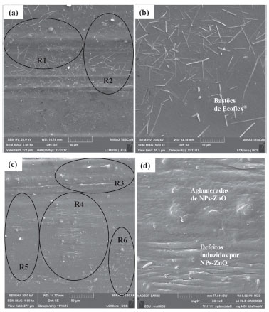 ![]() Figura 6. MMicrografias obtidas com microscopia eletrônica de varredura FEG. (a) Filme de Ecoflex® contendo 1% (m/m) de MCs-Zn (b) detalhes de bastoes de Ecoflex® formados nos filmes contendo MCs-Zn, (c) Filme de Ecoflex ® contendo 1% (m/m) de NPs-ZnO (d) detalhes dos aglomerados formados pelas NPs-ZnO e defeitos induzidos no filme de Ecoflex®.