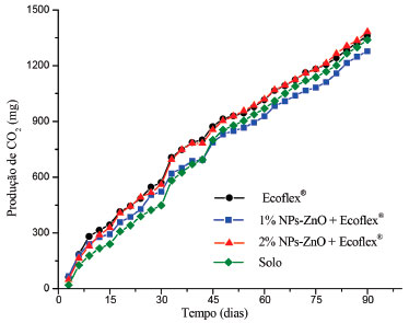 ![]() Figura 7. Evoluçao da quantidade de CO2 gerada durante os 90 dias de análise para os polímeros obtidos com e sem NPs-ZnO