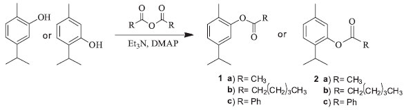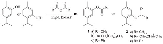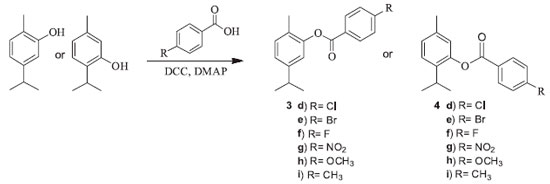 GENERAL PROCEDURES FOR PREPARATION OF 1A-C AND 2A-C AND SPECTRAL DATA Synthesis of the derivatives was performed by the described method.18 A mixture of different anhydrides (1.2 mmol) and carvacrol/thymol (0.67 mmol) in CH2Cl2 (30 mL) containing triethyl amine (111 µL) and catalytic amount of 4-dimethylaminopyridine (DMAP) was stirred for 24h at room temperature. The solution was washed with water and then, the organic phase was dried over anhydrous Na2SO4 and evaporated. The obtained products were purified by silica gel column chromatography with CH2Cl2 for 1a and 2a, and n-hexane for 1b, 1c, 2b and 2c. 5-isopropyl-2-methylphenyl acetate (carvacryl acetate-1a): Yield: 59%; GC-MS: m/z 192 [M+], 177 (1), 149(2), 150(70), 135(100); IR (KBr) ν/cm-1 2955, 1762, 1508, 1371, 1203, 900; 1H NMR (300 MHz, CDCl3) δ 1.24 (d, 6H, J 6.9), 2.15 (s, 3H), 2.32 (s, 3H), 2.89 (m, 1H), 6.87 (d, 1H, J 1.4), 7.02 (dd, 1H, J 1.5, 7.7), 7.15 (d, 1H, J 7.8); 13C NMR (75 MHz, CDCl3) δ 15.9, 21.0, 24.0, 33.7, 119.9, 124.3, 127.3, 131.1, 148.3, 149.5, 169.5. In agreement of literature.6,7,19 5-isopropyl-2-methylphenyl hexanoate (carvacryl hexanoate-1b): Yield: 91%; GC-MS: m/z 248 [M+], 191(1), 150(100), 135(70); IR (KBr) ν/cm-1 2959, 2870, 1760, 1507, 1459, 1226, 1145, 817; 1H NMR (300 MHz, CDCl3) δ 0.95 (t, 3H, J 6.9), 1.24 (d, 6H, J 6.9), 1.43 (m, 4H), 1.80 (m, 2H), 2.14 (s, 3H), 2.58 (t, 2H, J 7.5), 2.87 (m, 1H), 6.86 (d, 1H, J 1.3), 7.03 (dd, 1H, J 1.3, 7.8), 7.15 (d, 1H, J 7.8); 13C NMR (75 MHz, CDCl3) δ 14.1, 16.0, 22.5, 24.1, 24.9, 31.6, 33.8, 34.5, 120.0, 124.2, 127.3, 131.0, 148.2, 149.5, 172.3. 5-isopropyl-2-methylphenyl benzoate (carvacryl benzoate-1c): Yield: 46%; GC-MS: m/z 254 [M+], 149(1), 105(100), 77(25); IR (KBr) ν/cm-1 2961, 2868, 1737, 1600, 1503, 1451, 1260, 1062, 707; 1H NMR (300 MHz, CDCl3) δ 1.27 (d, 6H, J 6.9), 2.22 (s, 3H), 2.92 (m, 1H), 7.02 (s, 1H), 7.10 (d, 1H, J 7.8), 7.20 (d, 1H, J 7.8), 7.53 (t, 2H, J 7.6), 7.67 (t, 1H, J 7.4), 8.24 (d, 2H, J 74); 13C NMR (75 MHz, CDCl3) δ 16.0, 24.1, 33.8, 120.1, 124.4, 127.6, 128.8, 129.8, 130.4, 131.1, 133.7, 148.3, 149.7, 165.1. In agreement of literature.7 2-isopropyl-5-methylphenyl acetate (thymyl acetate-2a): Yield: 55%; GC-MS: m/z 192 [M+], 150(40), 135(100), 115(5); IR (KBr) ν/cm-1 2962, 2870, 1762, 1623, 1369, 1369, 1209, 1087, 898, 817; 1H NMR (300 MHz, CDCl3) δ 1.23 (d, 6H, J 6.9), 2.33 (s, 6H), 2.98 (m, 1H), 6.82 (br s, 1H), 7.04 (d, 1H, J 7.9), 7.21 (d, 1H, J 7.9); 13C NMR ( 75 MHz, CDCl3) δ 21.0, 21.1, 23.2, 27.4, 122.9, 126.6, 127.3, 136.7, 137.2, 148.1, 170.0. In agreement of literature.7,9 2-isopropyl-5-methylphenyl hexanoate (thymyl hexanoate-2b): Yield: 74%; GC-MS: m/z 248 [M+], 150(80), 135(100), 115(3); IR (KBr) ν/cm-1 2959, 2926, 2870, 1760, 1621, 1505, 1151, 815; 1H NMR (300 MHz, CDCl3) δ 0.95 (t, 3H, J 7.0), 1.20 (d, 6H, J 1.2), 1.43 (m, 4H), 1.80 (m, 2H), 2.32 (s, 3H), 2.58 (t, 2H, J 7.4), 2.97 (m, 1H), 6.81 (s, 1H), 7.03 (d, 1H, J 7.8), 7.20 (d, 1H, J 7.8); 13C NMR (75 MHz, CDCl3) δ 14.1, 21.0, 22.5, 23.2, 24.9, 27.3, 31.5, 34.6, 123.0, 126.5, 127.2, 136.7, 137.6, 148.2, 172.7. In agreement of literature.20 2-isopropyl-5-methylphenyl benzoate (thymyl benzoate-2c): Yield: 38%; GC-MS m/z 254 [M+], 149(30), 105(100), 77(40); IR (KBr) ν/cm-1 3030, 2962, 2924, 2868, 1733, 1600, 1451, 1236, 817, 708; 1H NMR (300 MHz, CDCl3) δ 1.23 (d, 6H, J 6.9), 2.36 (s, 3H), 3.08 (m, 1H, J 6.9), 6.97 (s, 1H), 7.08 (d, 1H, J 7.9), 7.27 (d, 1H, J 7.9), 7.54 (t, 2H, J 7.6), 7.66 (t, 1H, J 7.4), 8.24 (d, 2H, J 7.4); 13C NMR (75 MHz, CDCl3) δ 21.0, 23.2, 27.5, 126.7, 127.3, 128.8, 129.9, 130.3, 133.7, 136.8, 137.4, 148.4, 165.5. In agreement of literature.7,20 General procedures for preparation of 3d-i and 4d-i and spectral data The synthesis of the derivatives were performed by the described method.21 A mixture of different benzoic acid derivatives (2 mmol) and carvacrol/thymol (1 mmol) in CH2Cl2 (30 mL) containing N, N'-diciclohexilcarbodiimida (DCC) (2 mmol) and DMAP (2 mmol) was stirred for 4h at room temperature. The solution was filtered under vacuum and solvent was evaporated. The obtained products were purified by silica gel column chromatography with n-hexane/CH2Cl2 (50:50) (v/v), an fractions were analysed in TLC. 5-isopropyl-2-methylphenyl 4-chlorobenzoate (carvacryl 4-chlorobenzoate-3d): Yield: 67%; GC-MS: m/z 288 [M+], 141(35), 139(100), 113(10), 111(30); IR (KBr) ν/cm-1 2959, 1732, 1593, 1503, 1261, 1070, 753; 1H NMR (300 MHz, CDCl3) δ 1.27 (d, 6H, J 6.9), 2.20 (s, 3H), 2.92 (m, 1H), 7.01 (s, 1H), 7.08 (d, 1H, J 7.8), 7.21 (d, 1H, J 7.7), 7.51 (d, 2H, J 7.7), 8.32 (d, 2H, J 7.7); 13C NMR (75 MHz, CDCl3) δ 16.0, 24.1, 33.8, 120.0, 124.5, 127.5, 128.5, 129.2, 131.2, 131.7, 149.5, 164.2. 5-isopropyl-2-methylphenyl 4-bromobenzoate (carvacryl 4-bromobenzoate-3e): Yield: 64%; GC-MS: m/z 332 [M+], 185(100), 183(100), 155(20), 153(20); IR (KBr) ν/cm-1 2960, 1738, 1589, 1503, 1261, 1073; 1H NMR (300 MHz, CDCl3) δ 1.27 (d, 6H, J 6.9), 2.19 (s, 3H), 2.92 (m, 1H), 7.00 (s, 1H), 7.08 (d, 1H, J 7.7), 7.21 (d, 1H, J 7.7), 7.68 (d, 2H, J 8.4), 8.09 (d, 2H, J 8.4); 13C NMR (75 MHz, CDCl3) δ 16.0, 24.1, 33.8, 120.0, 124.5, 127.4, 128.8, 128.9, 131.2, 131.8, 132.1, 148.4, 149.5, 164.4. 5-isopropyl-2-methylphenyl 4-fluorobenzoate (carvacryl 4-fluorobenzoate-3f): Yield: 96%; GC-MS: m/z 272 [M+], 149(1), 123(100), 95(30); IR (KBr) ν/cm-1 2962, 1739, 1605, 1508, 1263; 1H NMR (300 MHz, CDCl3) δ 1.27 (d, 6H, J 6.9), 2.20 (s, 3H), 2.92 (m, 1H), 7.01 (d, 1H, J 1.3), 7.06 (dd, 1H, J 1.5, 9.3), 7.18 (d, 1H), 7.20 (dd, 2H, J 5.5, 7.8), 8.25 (dd, 2H, J 5.5, 7.8); 13C NMR (75 MHz, CDCl3) δ 16.0, 24.1, 33.8, 116.0, 120.0, 124.5, 126.1, 127.5, 131.2, 132.9, 148.4, 149.6, 164.1, 166.5. 5-isopropyl-2-methylphenyl 4-nitrobenzoate (carvacryl 4-nitrobenzoate-3g): Yield: 55%; GC-MS: m/z 299 [M+], 149(5), 150(100), 122(1); IR (KBr) ν/cm-1 2965, 1736, 1524, 1348, 1272, 711; 1H NMR (300 MHz, CDCl3) δ 1.27 (d, 6H, J 1.6), 2.21 (s, 3H), 2.93 (m, 1H