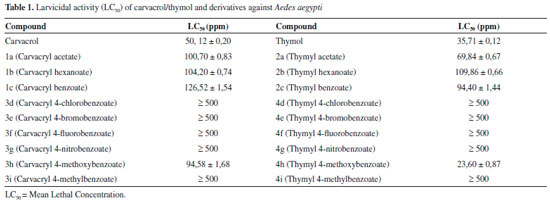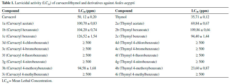 RESULTS AND DISCUSSION Carvacrol and thymol are the main components of the essential oils of oregano, thyme, and savory and used as a chemical defense mechanism against phytopathogenic microorganisms interacting with the cell membrane of the pathogen.25 The hydrophobic nature of carvacrol and thymol interact with the lipid bilayer of cytoplasmic membranes cause loss of integrity and leakage of cellular material such as ions, ATP and nucleic acid.26 Generally, the derivatization of hydroxylated monoterpenes results in enhancement of larvicidal activity against Aedes aegypti of newly obtained compounds, because the presence of hydroxyl groups on their parent structures results in decreased potency, preventing substance penetration in the larva cuticle,27-31 although this may also result in a decreased activity.32 Thus, the synthesis of derivatives of carvacrol/thymol by simple synthetic procedures, such as acylation, consists of a method of obtaining these compounds. The acylation reactions were performed using readily accessible reagents available from the research group, from which different acid anhydrides and different carboxylic acids derived from benzoic acid. The esterification methodology were carriied with DMAP and DCC, which have the function of catalyzing and increasing the electrophilicity of the carbonyl of the carboxylic acid used, respectively. These reactions are largely employed in organic synthesis because of their high efficiency.33 In total, 18 derivatives were obtained, of which compounds 1b, 3e and 2e are unpublished and the NMR data of compounds 1d, 1f, 1g, 1i, 2d, 2f, 2g and 2i are being reported for the first time in literature. The compounds were characterized by GC-MS, IR 1H NMR and 13C NMR. The derivatives yields ranging from 38 to 96%. Among the derivatives obtained from reactions with anhydrides, (1a, 1b, 1c) and (2a, 2b, 2c), the compounds 1b and 2b, products of the reactions with hexanoic anhydride, showed better yields with of 91% and 74%, respectively. Among the compounds obtained from the reactions with the derivatives of benzoic acid, (3d, 3e, 3f, 3g, 3h, 3i) and (4d, 4e, 4f, 4g, 4h, 4i), those obtained from the halogenated benzoic acid showed better yields, among which compounds 3f and 4e, showed yields 96 and 89%, respectively. The method of Ellman was used to determine inhibition of acetylcholinesterase. The formation of a white halo around the TLC "spots" is indicative of AChE enzyme inhibition. The diameter of the halos were measured (cm), and compared with the positive standard Eserine (1.4 cm). Only compounds 5-isopropyl-2-methylphenyl acetate (1a) and 2-isopropyl-5-methylphenyl hexanoate (2b) showed positive results, with the diameters 1.2 and 1.4 cm, respectively, close to the positive control Eserine (1.4 cm) and can be represent promising potential for inhibition of AChE. The larvicidal tests were carried out to determine the lethal concentration (LC50) against instar III larvae of Aedes aegypti, and the results are showed in Table 1. According to literature, compounds with LC50 values of up to 100 ppm are considered to be excellent larvicidal agents.34 The compounds carvacrol and thymol presented an excellent activity, showing LC50 values of 50.12 ± 0.20 and 35.71 ± 0.12 ppm, respectively, and these results are in agreement with data reported in the literature.32