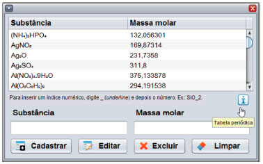 OPÇOES BASICAS E RECURSOS ADICIONAIS A área de trabalho da versao atual do GlassPanacea (versao 3.0 Beta) possui uma configuraçao simples e intuitiva, visando à combinaçao de recursos com facilidade de uso. O ícone Banco de dados, por exemplo, disponível na barra de ferramentas padrao, permite a consulta e o cadastro de novas substâncias (reagentes) para a simulaçao dos cálculos. É importante ressaltar que o banco de dados é aberto, possibilitando que o usuário construa a sua própria base. No programa, consta um banco de dados pré-cadastrado que, como mencionado, poderá ser complementado conforme a necessidade do usuário. Para inserir uma nova substância, é necessário digitar a sua fórmula química e a massa molar nos respectivos campos. Em seguida, basta acionar o botao Cadastrar para que os dados sejam incluídos - a disposiçao das substâncias cadastradas é automática e feita em ordem alfabética. Para ajudar nessa tarefa, uma tabela periódica é disponibilizada por meio do ícone de informaçao localizado no canto inferior direito da janela. Sao disponibilizadas também as funçoes Editar e Excluir, caso haja necessidade de alteraçao de algum dado, como mostra a Figura 1.