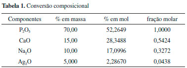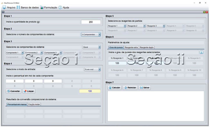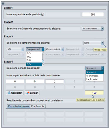Seguindo os passos sugeridos, na etapa 1 o usuário determina a quantidade de produto desejado. O programa foi desenvolvido para simular a preparaçao desde poucos gramas até toneladas de material, atendendo tanto laboratórios de pesquisa, onde é comum a preparaçao de pequenas quantidades de amostra, como indústrias, com produçao em larga escala. Na etapa 2, é necessário indicar o número de componentes do sistema pretendido, tendo como opçao o máximo de dez componentes. Considerando um sistema formado por óxidos, como o Li2O-ZrO2-SiO2 (LZS), entende-se como componente cada um dos óxidos individuais que constituem o sistema - nesse caso, sendo o componente 1 = Li2O, o componente 2 = ZrO2 e o componente 3 = SiO2. Com a escolha do número de componentes, nas demais etapas é habilitado um número correspondente de campos para a inserçao dos dados. Dessa forma, se o sistema pretendido possuir três componentes, como mostra a Figura 2, estarao habilitados nas etapas de 3 a 6 apenas três campos para que sejam fornecidas as informaçoes necessárias para a realizaçao dos cálculos. Para facilitar a escolha dos componentes, na etapa 3 é disponibilizado um filtro de seleçao. Assim, é possível selecionar os componentes de interesse a partir da lista geral de substâncias cadastradas no banco de dados ou agrupá-los de uma forma específica, como, por exemplo, em óxidos. Normalmente, a composiçao de um sistema é expressa em termos das porcentagens molares ou mássicas de cada constituinte. Menos comum, mas também encontrada na literatura, é a notaçao em que se utilizam as fraçoes molares dos constituintes. Devido a essas variaçoes, disponibilizamos na etapa 4 os três modos para que o usuário tenha liberdade de escolher a notaçao que lhe for mais conveniente. Caso haja interesse na conversao de uma forma para outra, basta acionar o botao Converter e serao gerados resultados como os demonstrados na Tabela 1 para o fosfato contendo 70%P2O5, 15%CaO, 10%Na2O e 5%Ag2O (% em massa). Para auxiliar no preenchimento dos campos, um contador, destacado em amarelo, é exibido para a contabilizaçao da fraçao total do sistema (100). A contagem é decrescente, sendo o valor descontado à medida que o percentual dos componentes é inserido. Dessa forma, o valor zero (0) indica que todos os campos foram corretamente preenchidos.