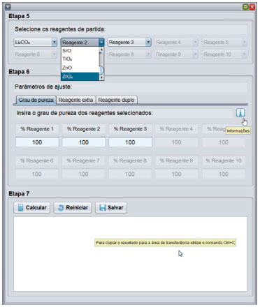 Na etapa 5, devem ser selecionados os reagentes que irao suprir cada componente do sistema de acordo com suas respectivas fraçoes. Ao acessar a guia de seleçao, sao mostradas todas as substâncias cadastradas no banco de dados. Isso proporciona flexibilidade na escolha e permite a simulaçao de diferentes combinaçoes de reagentes que possam ser adequados ao experimento num intervalo muito curto de tempo. Para atender às necessidades de um maior número de usuários, o programa dispoe de alguns recursos extras na etapa 6. Definidos como parâmetros de ajuste, eles estao disponíveis nas abas designadas como Grau de pureza, Reagente extra e Reagente duplo. A descriçao de cada um deles pode ser acessada no programa por meio do ícone de informaçao, localizado no canto superior direito, e se dá conforme a seguinte relaçao: