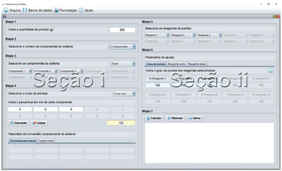 O ícone Formulaçao, na barra de ferramentas, dá acesso à janela para realizaçao dos cálculos. Nessa janela do programa, alguns recursos sao disponibilizados, tais como a possibilidade de se determinar a quantidade de produto a ser preparado, a conversao do percentual em mol de cada componente do sistema pretendido para massa ou fraçao molar e o ajuste de pureza dos reagentes selecionados. Para facilitar a explicaçao de funcionamento, na Figura 2 sao destacadas duas seçoes nessa janela: a primeira (i), compreendendo as etapas de 1 a 4, e a segunda (ii), as etapas de 5 a 7. As imagens ampliadas e detalhadas dessas seçoes sao mostradas nas Figuras 3 e 4, respectivamente.