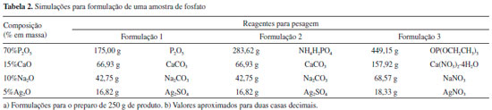 Após a realizaçao das etapas de 1 a 6, acionando o botao Calcular, na etapa 7, é gerado um relatório contendo os passos adotados pelo usuário, bem como a massa dos reagentes que deverá ser utilizada para a obtençao do produto de interesse. A Tabela 2 mostra os resultados de algumas simulaçoes envolvendo diferentes combinaçoes de reagentes para o preparo do fosfato de composiçao 70%P2O5, 15%CaO, 10%Na2O e 5%Ag2O (% em massa), discutido anteriormente. Nessa etapa, as opçoes de reiniciar os cálculos ou salvar os resultados também sao disponibilizadas.