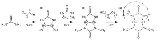 ![]() Figura 2. Esquema de síntese para obtençao da (a) 4,5-di-hidroxi-imidazolidin-2-ona, (b) 2,4-dimetilglicolurila e (c) metil-bambus[6]urila