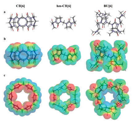 ![]() Figura 3. (a) Visao lateral dos macrociclos CB[6] (esquerda), hmCB[6] (centro) e BU[6] (direita). Mapa de densidade superficial de elétrons dos mesmos macrociclos, visto (b) de lado e (c) por cima. As superfícies foram calculados por DFT a nível de teoria B3LYP/6-31G*. As regioes em vermelho e azul representam, respectivamente, regioes de maior e menor densidade eletrônica