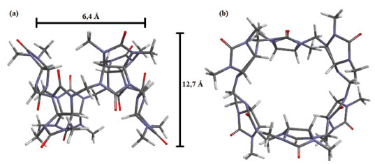 Algo interessante é que as cucurbit[n]urilas (CB[n]), que sao estruturalmente análogas às BU[n], também sao obtidas a partir da reaçao de condensaçao de uma glicolurila com formaldeído em meio ácido.4 No entanto, o arranjo diferente das unidades de glicolurila na estrutura das CB[n] faz com que formem complexos com cátions e moléculas neutras. As hemi-cucurbit[n]urilas (hmCB[n]),18,19 outro tipo de macrociclo hospedeiro, sao formadas a partir de grupamentos imidazolidin-2-ona conectados por pontes metilênicas. Basicamente, a estrutura das hmCB[n] é similar a uma CB[n] cortada simetricamente pelo plano equatorial. Como as unidades imidazolin-2-ona das hmCB[n] sao ligadas somente por uma ponte metilênica, a estrutura desses macrociclos é pouco rígida e permite a alternância dos monômeros, da mesma forma que ocorre com as BU[n]. Isso ocasiona na formaçao de uma regiao com menor densidade eletrônica no centro da molécula, fazendo com que as hmCB[n] e as BU[n] apresentem maior afinidade por ânions. Comparando a estrutura da MeBU[6], da hmCB[6] e da CB[6] é possível verificar que o arranjo espacial dos monômeros e sobretudo sua liberdade para adotarem ou nao a configuraçao alternada sao fatores preponderantes nas propriedades das cavidades que delimitam, como solvofobicidade e seletividade (Figura 3).20