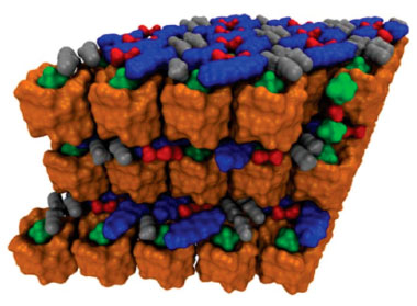 ![]() Figura 7. Empacotamento da estrutura cristalina do sistema MeBU[6]/MV2+/PF6- (bambusurila: marrom; MV2+: azul; PF6-: verde; acetonitrila: cinza; água: vermelho). Reproduzido parcialmente com permissao da American Chemical Society (2017, v. 139, p. 2598)