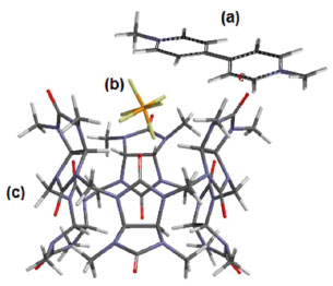 ![]() Figura 8. Complexo de metil-viologênio (a), hexafluorofosfato (b) e metil-bambus[6]urila (c), passível de transferência de elétrons foto-induzida do macrociclo para o metil-viologênio