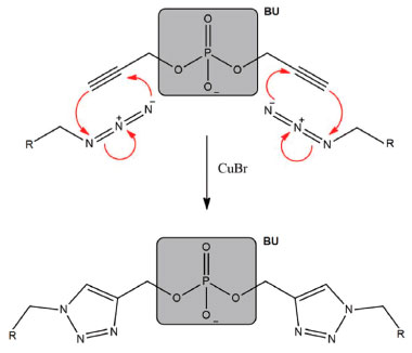 Sindelar e colaboradores75 tentaram sintetizar caviplexos com BnBU[6] e diversos diaquil fosfatos. Diferentemente do complexo anterior, o grupamento fosfato pode ser incluído no interior do macrociclo na proporçao 1:1 em duas configuraçoes distintas em soluçao: internamente, de forma que os substituintes alquila fiquem voltados para fora em sentido oposto, ou externamente, com o grupamento fosfato parcialmente incluído e os substituintes voltados para fora no mesmo sentido. A configuraçao do tipo externa fez com que os autores estudassem a capacidade das BU[n] de formarem rotaxano, sendo o macrociclo o rotor e os derivados de íons fosfatos os eixos. Algo interessante é que poucos rotaxanos baseados na inclusao de espécies aniônicas em macrociclos foram reportados na literatura até o presente momento,75-78 sendo a formaçao de rotaxanos com BU[n] algo no mínimo incomum. Baseado nisso, foram realizados experimentos de inclusao de fosfatos aniônicos contendo grupos alcinos terminais como substituintes e posterior reaçao de condensaçao com azidas substituídas, na presença de brometo de cobre (I), para a formaçao dos respectivos triazóis. O objetivo dos autores era verificar se os triazóis e a BnBU[6] formavam rotaxanos e como o tamanho do subtituinte dos íons azida influenciaria na estabilidade desses sistemas supramoleculares (Figura 11). Os resultados de RMN de 1H mostraram que os triazóis com substituintes pouco volumosos, como etila e propila, podiam se desligar do macrociclo, enquanto os mais volumosos, como trifenilmetila, nao permitiam a descomplexaçao da supermolécula em soluçao, o que em princípio pareceu promissor.