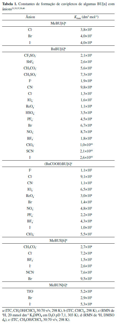 Outros exemplos de substituiçao do hetero-átomo do grupamento 1,3-dimetilureia da BU[n] reportado na literatura sao as metil-semiaza-bambus[4]urila (MeBUN[4]) e metil-semiaza-bambus[6]urila (MeBUN[6]),40,41 macrociclos obtidos a partir da reaçao das MeBUS[4] e MeBUS[6] com aminas em refluxo de tetrahidrofurano. Estas semiaza-bambusurilas, sao capazes de complexar múltiplos ânions em suas cavidades como, por exemplo, dois íons trifluorometanossulfonato e um íon iodeto simultaneamente. Ao mesmo tempo que as MeBUN[4] e MeBUN[6] sao capazes de formar caviplexos relativamente estáveis com ânions, estes sao lábeis o suficiente para desligarem-se deles em determinadas condiçoes e permitir seu trânsito pelas cavidades, evidenciando assim seu potencial como ionóforos sintéticos. Titulaçoes calorimétricas isotérmicas (ITC) e de RMN de 1H foram efetuadas para obtençao das constantes de formaçao dos caviplexos (Kform) de BU[n] com diversos ânions (Tabela 1). A partir dos resultados obtidos, é possível verificar que o tamanho e simetria do ânion caviplexado influenciam na afinidade, bem como o substituinte ou hetero-átomo do macrociclo.