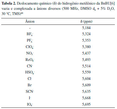 ALGUMAS APLICAÇOES Detecçao de ânions em mistura por RMN de 1H Sensores químicos seletivos a analitos específicos sao importantes para detecçao e quantificaçao de cátions,42 ânions43 ou moléculas neutras.44 Existe uma grande demanda por sistemas químicos capazes de identificar ânions em soluçao como por exemplo, em análises de água e análises ambientais em geral.45 A maioria dos sensores para ânions descritos na literatura opera em meio orgânico, sendo ainda escassos aqueles que funcionem em água.46,47 Dada a capacidade das BU[n] de incluir ânions seletivamente, Sindelar e seu grupo48 adicionaram os derivados BnBU[6] (DMSO-d6 + 5% de D2O) e (BnCOOH)BU[6] (K2DPO4 20 mmol dm-3 em D2O), respectivamente, a soluçoes que continham doze ânions distintos e realizaram análises de RMN de 1H na tentativa de utilizar esses macrociclos como sensores de ânions. Os espectros de RMN de 1H indicaram a formaçao de caviplexos com estequiometria de 1:1 e os deslocamentos químicos observados permitiram a identificaçao dos respectivos ânions (BF4-, PF6-, ClO4-, NO3-, ReO4-, CN-, HSO4-Cl-, Br-, I-, SCN-, IO4-), confrontando os resultados com experimentos controle com os caviplexos de ânions isolados. A BnBU[6] apresenta elevada seletividade em complexar com os ânions, sendo que a maioria destes pôde ser identificada pelo simples deslocamento químico dos hidrogênios da ponte metilênica (Tabela 2). Por outro lado, a (BnCOOH)BU[6], que é mais solúvel em água, apresenta menor afinidade pelos ânions Cl-, CN-, IO4-, ReO4- e possibilita somente a diferenciaçao de quatro dos doze ânions em mistura somente (PF6-, ClO4-, I-).
