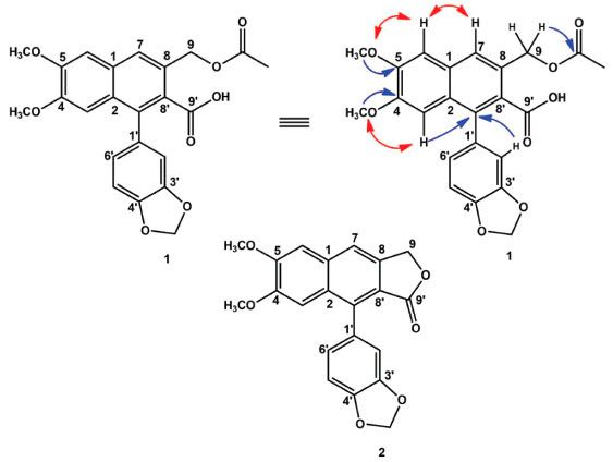 ![]() Figure 1. Luclaricin (1) and justicidin B (2) isolated from the P. acuminatus. Some key NOESY ( ![]() ![]()
