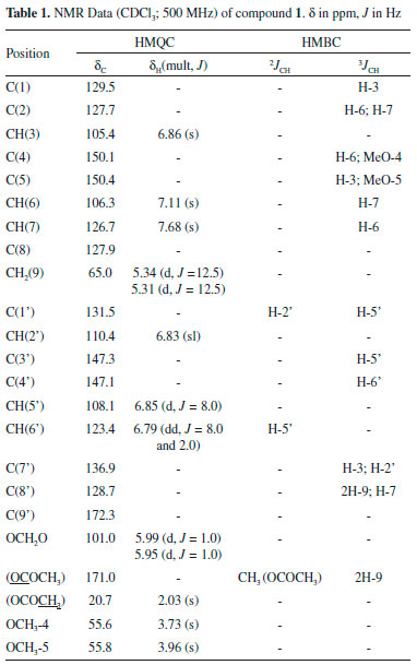 RESULTS AND DISCUSSION Compound 1 was isolated as an oil. The high resolution ESI mass spectrum showed a peak of the adduct ion [M+Na]+ at m/z 447.1065 (calcd. for C23H20NaO8Na, 447.1055) which was compatible with this molecular formula C23H20O8. In 13C-NMR spectrum, the presence of twenty-three signals were observed. Twelve of them were assigned to non-hydrogenated carbons, six to methine carbons, two to oxymethylene carbons, two to methoxylic carbons, and one to a methyl carbon. The chemical non-hydrogenated carbon shifts between δC 127.7 and 150.4 were compatible with carbon skeleton of an arylnaphthalene lignan. The corresponding signal to C-9 at δC 65.0 suggested the presence of a primary alcohol. Also, signals at δC 171.0 and 20.7 were observed and when they were associated to the C-9 chemical shift, it inferred the insertion of an acetoxy group in that position.6 Also, corroborating with infrared spectrum that showed a broad band at 3100-3500 cm-1 and a strong band at 1680 cm-1, the signal at δC 172.3 indicated a carboxylic acid at C-9'. The other carbons chemical shifts were similar to phyllanthostatin A and they are compiled in Table 1. In 1H NMR spectrum, it was observed three singlets corresponding to only one proton each and their chemical shift were determined at δH 6.86, 7.11 and 7.68. Also, signals corresponding to an ABX system at δH 6.83 (sl), 6.85 (d, J = 8.0) and 6.79 (dd, J = 8.0 and 2.0) were detected. All these signals, when compared to literature values8 confirmed the arylnaphtalene-type lignan skeleton for compound 1 and they were assigned as H-3, H-6, H-7, H-2', H-5', and H-6', respectively. This hydrogenation pattern was also inferred from substitution of carbons C-4, C-5, C-3', and C-4'. The signals at δH 5.99 (d, J = 1.0) and 5.95 (d, J = 1.0) were compatible to the methylenedioxy substituent, and the signals centered at δH 3.73 and 3.96 were assigned to two methoxyl groups. Two doublets in δH 5.34 (d, J = 12.5) and δH 5.31 (d, J = 12.5) were assigned to the methylene group at C-9. Also, there was a singlet at δH 2.03, which is characteristic of acetyloxy group. In HMQC spectrum, the following correlations were observed: δH 6.86 (H-3) with the signal at δC 105.4, H-6 (δH 7.11) with the signal at δC 106.3, and H-7 (δH 7.68) with the carbon at δC 126.7. These correlations supported the assigned signals for H-3/C-3, H-6/C-6 and H-7/C-7 of the arylnaphthalene structure substituted at C-4 and C-5. The signal at δC 126.7 (C-7) corroborated with the lactone ring-opening and the oxidation in C-9' (δC 172.3).6 The observed correlations for δH 5.34/5.31 (2H-9) with the carbon at δC 65.0 as well as signals centered at δH 5.95 and 5.99 (OCH2O) with the carbon in δC 101.0 and δH 3.73 and 3.96 with carbons at δC 55.6 and 55.8, confirmed the presence of methylenedioxy and two methoxyl substituents. A HMBC experiment was used for the total assignments of 1H and 13C NMR spectra and the following signal correlations were observed: δH 7.68 (H-7) / δC 65.0 (C-9) and 106.3 (C-6); δH 7.11 (H-6) / δC 150.1 (C-4) and 150.4 (C-5). Methoxyl groups location were identified by correlations of signals at δH 3.73 with C-4 (δC 150.1) and δH 3.96 with C-5 (δC 150.4). The methylenedioxy substituents are located at C-3' and C-4' by signal correlations of δH 5.99 and 5.95 with δC 147.3 and 147.1, respectively. Correlations of signals centered at δH 5.34 / 5.31 (2H-9) with δC 128.7 assigned position of C-8' and with the carbon at δC 171.0, it was assigned the position for the esterification by acetoxyl group. The remaining correlations are summarized in Table 1. The signal at δH 7.11 was assigned to H-6 and through NOESY experiment (Figure 1), it was possible to observe the following correlation with δH 3.96 (OCH3-5). H-6 was also correlated with the signal at δH 7.68 (H-7), and this one interacted with 5.34 (H-9). The signal at δH 3.73 (OCH3-4) was correlated with signal at δH 6.86 (H-3). In this context, an early event that happens during arynaphtalene lignans biogenesis, it is the primary alcohol oxidation that leads to the acid, which is followed by lactonization. However, this lactonization is not possible for compound 1 due to the acylation of one of hydroxymethylene group at C-9, which precludes the lactone ring formation. Thus 1 is an arylnaphthalene lignan called luclaricin, a new natural product.