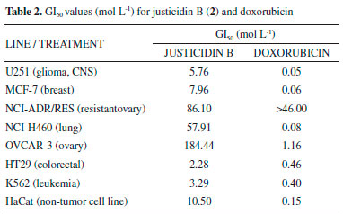 Compound 2 was identified by comparison to literature as justicidin B.8 This compound has already been isolated in other species of this genus (P. ansiolobus, P. myrtifolius, P. piscatorum and P. polyphyllus), and it was isolated in the roots9 of the species studied in this work and recently it has also been reported in its leaves.10 This compound presented cytostatic activity with values of GI50 varying from 2.28 to 184.44 mol L-1 for colorectal and ovary cell lines, respectively (Table 2). Cytotoxic effect was observed specially for glioma cell line at a concentration of 5.76 mol L-1. Literature data have shown justicidin B cytotoxic effects in tumor and non-tumor cell lines.11 However, its effect on glioma cell line is described for the first time here. Justicidin B showed cytotoxicity by inducing apoptosis and NF-B modulation in human non-hodgkin lymphoma cells (DOHH-2),12 and breast cancer derived cell lines (MDA-MB-231 and MCF-7).13 In addition, justicidin B showed significant fungicidal and antiprotozoal effects,11 anti-inflammatory activity14 and low in vivo toxicity in mice.12