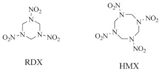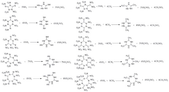 I. School of Chemistry and Pharmaceutical Engineering and Qilu University of Technology (Shandong Academy of Sciences), Ji'nan - 250353, China Recebido em: 10/09/2018 *e-mail: jingetiema0000@126.com A series of cyclic energetic derivatives based on nitroguanidine and 1,1-diamino-2,2-dinitroethene were theoretically designed. The spatial structures, infrared spectrometry, heats of formation, electronic structures, detonation properties, and thermal stabilities of these designed compounds were fully investigated by density functional theory. It is found that all the designed compounds have moderate stabilities (bond dissociation energies range from 11.3 to 99.0 kJ mol-1), high crystal densities (from 1.9589 to 2.00188 g cm-3), high positive heats of formation (from 649.6 to 1060.8 kJ mol-1) and high positive heats of detonation (from 1074.77 to 1332.06 cal g-1) which lead to the excellent detonation properties (detonation velocities range from 8.71 to 9.05 km s-1 while detonation pressures range from 35.47 to 38.55 GPa). Electronic structures such as electrostatic potentials on the surface, electronic densities, highest occupied molecular orbitals, lowest unoccupied molecular orbitals and their energy gaps were also simulated to give a better understanding of chemical and physical properties of these compounds. All the data may shine lights on the explosive searching and synthesis. INTRODUCTION High energy density materials have been receiving a continuous interests due to their high positive heats of formation (HOFs), excellent detonation properties and acceptable thermal stabilities which lead to the wide applications both in military and civilian.1-5 For instance, hexahydro-1,3,5-trinitro-1,3,5-triazine (Figure 1, RDX) and 1,3,5,7-tetranitro-1,3,5,7-tetraazacyclooctane (Figure 1, HMX) are of this type of energetic materials with positive heats of formation (HOF, 79 kJ mol-1 and 102.4 kJ mol-1, respectively),6 acceptable impact sensitivities (h50, 26 cm and 29 cm, respectively),7 excellent detonation velocities (D, 8.75 km s-1 and 9.10 km s-1, respectively) and detonation pressures (P, 34.0 GPa and 39.0 GPa, respectively)6. The main reasons were summarized as follows: (1) There exists a large amount of C―N or N―N chemical bonds in the molecule. (2) The cyclic structure will also release lots of energy due to the ring-opening reaction. (3) The high nitrogen content. All these described reasons will make great contribution to the energetic properties during the thermal decomposition or detonation process of these explosives.