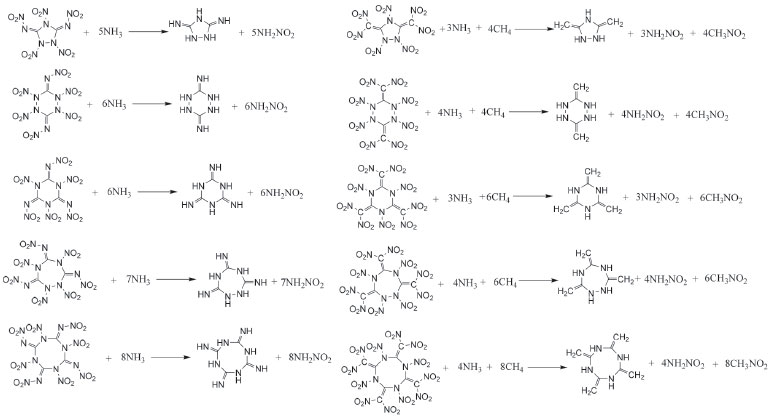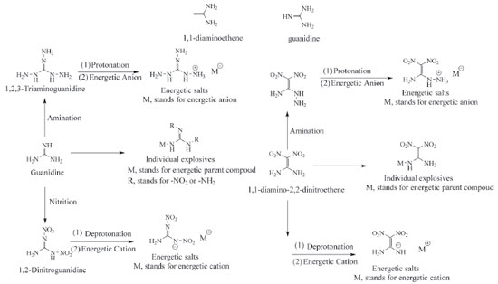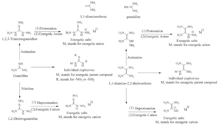 Not surprisingly, 1,1-diaminoethene and guanidine (Figure 2) consist of this type of structure with high nitrogen content of 48.23% and 71.14% respectively, and exist a large amount of C―N or N―N chemical bonds. To our knowledge, 1,1-diaminoethene and guanidine as energetic materials were mainly expressed in the following form: 1,1-diamino-2,2-dinitroethene,8,9 1,2,3-triaminoguanidine,10 1,2-dinitroguanidine,11 energetic salts12-17 and 1,1-diamino-2,2-dinitroethene or guanidine based individual explosives (Figure 2).18,19 Although there are many species of 1,1-diaminoethene or guanidine based energetic materials, each has different advantages and disadvantages with respect to the stabilities and deto nation properties. For example, 1,2-dinitroguanidine, whose detonation properties were superior to RDX, was a strong acid which in turn limited its applications. This is because the hydrogen atom located in ― NHNO2 group was easily to be dissociated due to the strong electron withdrawing effect of nitro group.20