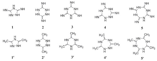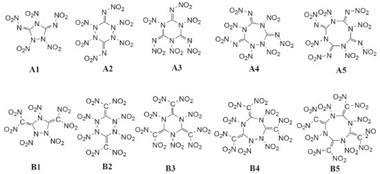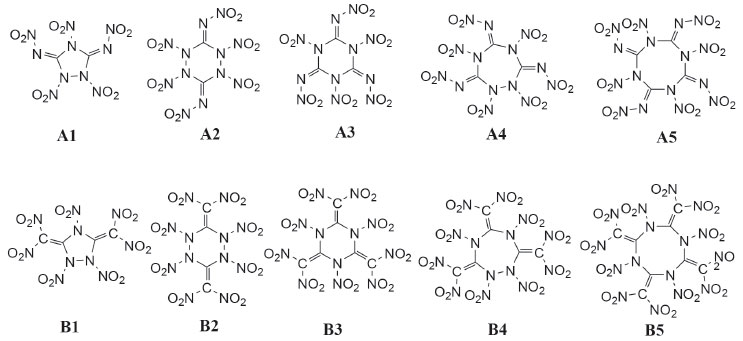 Since cyclic structure may release lots of energy due to the ring-opening reaction during the thermal decomposition or detonation process of an explosive, it led to the idea of designing a series of guanidine based cyclic energetic parent compounds (Figure 3, compounds 1-5 and 1'-5'). Till now, little research was done on cyclic energetic materials based on nitroguanidine and 1,1-diamino-2,2-dinitroethene.21,22 On the other hand, it was also found that the increasing number of nitro groups into the cyclic compound can lead to an increase in mass densities, heats of formation and detonation properties. And finally, aiming at looking for new high energy density materials with better detonation properties, some cyclic nitroamines were designed (Figure 4, A1-A5 and B1-B5).