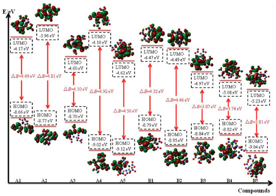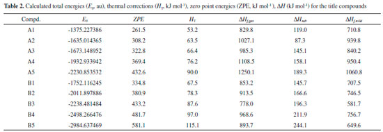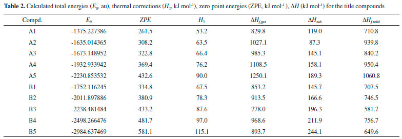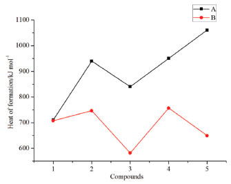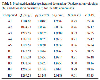 Table 2 summarized E0, HT, ZPE, gas-phase heat of formation (Hf,gas) and solid-phase heat of formation (Hf,solid) of the designed compounds at the B3LYP/6-31G (d, p) level. Obviously, solid-phase heat of formation of compounds that substituted by nitro group were higher than that of the parent compounds. HOFs of compounds A1-A5 were from 710.8 (compound A1) to 1060.8 kJ mol-1 (compound A5) while compounds B1-B5 were from 581.7 (compound B3) to 756.7 kJ mol-1 (compound B4). These high positive heats of formation may be profited from the large amounts of N-N and C-N bonds and the strain energy of the ring in the molecule.