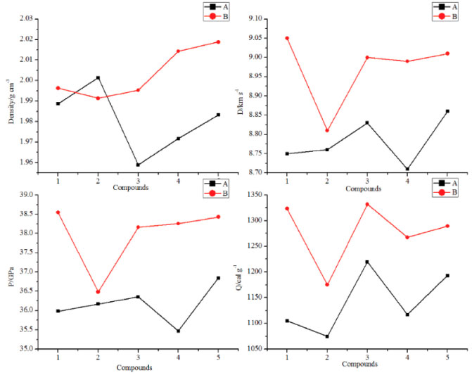 Detonation properties Detonation properties such as heat of detonation (Q), density (ρ), detonation velocity (D) and detonation pressure (P) were important indicators to reflect the energetic performance of an energetic material. These parameters were summarized and listed in Table3.