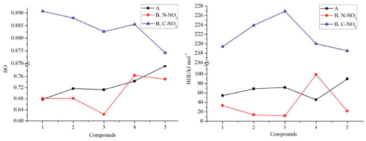 Figure 8 displays the variation in BO and BDE of C-NO2 and N-NO2 bonds, respectively. It is found that BO of C-NO2 (range from 0.8742 to 0.8907) is higher than those of N-NO2 (series A, range from 0.6777 to 0.7981, series B, range from 0.6239 to 0.7639) and consequently, BDE of C-NO2 (range from 218.5 to 226.9 kJ mol-1) is higher than those of N-NO2 (series A, range from 45.5 to 0.89.5 kJ mol-1, series B, range from 13.7 to 99.0 kJ mol-1). It is predicted that N-NO2 bond will be firstly dissociated out from the ring rather than C-NO2 bond during the decomposition process of these designed compounds. Based on the BDE values, the thermal stable order of series A can be defined in the order of A5>A3>A2>A1>A4 while series B were in the order of B4>B1>B5>B2>B3.