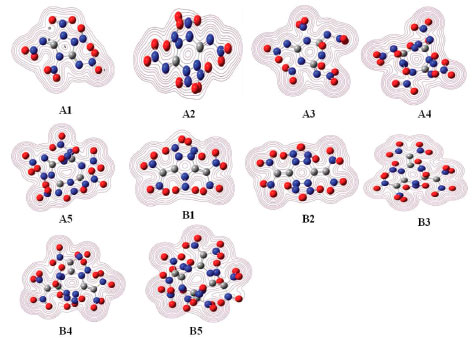 From the figure, it is clear thatthe distribution of the HOMO and LUMO varies from different compounds: LUMOs and HOMOs of compounds A1, A3, A4, A5, B1, B3, B4 and B5 were mostly localized on the nitro groups while compounds A2 and B2 were localized both on the ring and nitro groups. In addition, the values of LUMO of these designed compounds range from -5.23 to -3.96 eV while values of HOMO range from -9.12 to -8.82eV. In view of the energy gap between HOMO and LUMO, the values range from 3.74 (compound B4) to 4.92 eV (compound A4) which means that compound A4 has the worst chemical reactivity while compound B4 will be easily reacted with other reagents under given conditions. Again, the reactivity of all the designed compounds can be drawn in the following order: B4>B5>B3>B1>B2>A3>A1>A5>A2>A4. Obviously, the reactivity of series B were higher than that of series A which may be due to the increasing number of nitro groups. Take compounds A1 (ΔE=4.49 eV) and B1 (ΔE=4.32 eV) for example, though they have similar parent chemical structure, compound B1 was more active than compound A1 since more nitro groups were located in compound B1. This phenomenon was consistent with the effect that the increasing number of nitro group will improve energetic properties effectively while it will decrease the stability of a compound evidently.38 Electronic density Electronic density is a fundamental indicator to express a variety of chemical and physical properties of a molecule. Thus, contour line map of the electronic density of the designed compounds were investigated and illustrated in Figure 10. It is seen from the picture that delocalization occurred in the ring (for example, Figure 10, A1, region A) and will improve the stability of the ring skeleton which in turn will improve the stability of the compound. Oppositely, electron densities were found to be concentrated in the bonding area (Figure 10, A1, region B) because of electron pair sharing between atoms bonded covalently. Also, the electron densities around the oxygen and nitrogen atoms were seen higher than those around other atoms (Figure 10, A1, region C) due to strong electro negativity. This is because high peaks correspond to the nuclear charge of the heavy nucleus, which will make great contribution to improve electron aggregation and display integral exponential attenuation towards all surrounding atoms. Finally, electronic density reduced in region D because of the repulsive interactions of lone pair electrons among the adjacent atoms. The reduction of repulsion between adjacent lone pairs were also found by involving the lone pairs of alternate nitrogen atoms in coordinate covalent bonding to carbon atoms which in turn will stabilize the designed compounds. For example, compound A5 possesses this type of structure and consequently, it has the highest BDE value among series A which means that compound A5 was more stable than compounds A1-A4.