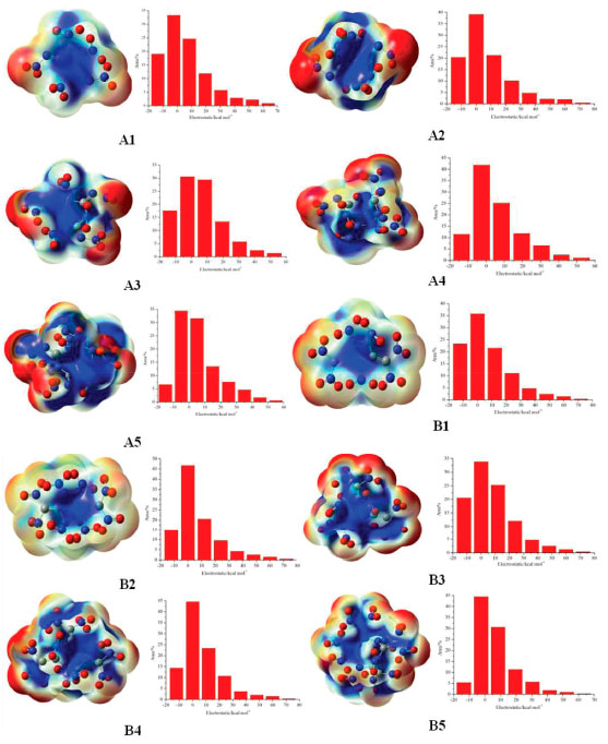 Electrostatic potential Electrostatic potential (ESP) on molecular surface is a critical parameter since it can provide meaningful information in understanding the charge distributions and molecular reactivity.39,40 Figure 11 presents the ESP and surface area of these designed compounds at the B3LYP/6-31G(d, p) level. It also should be pointed out that the red color in the picture denotes the most negative potential while the blue color denotes the most positive potential.