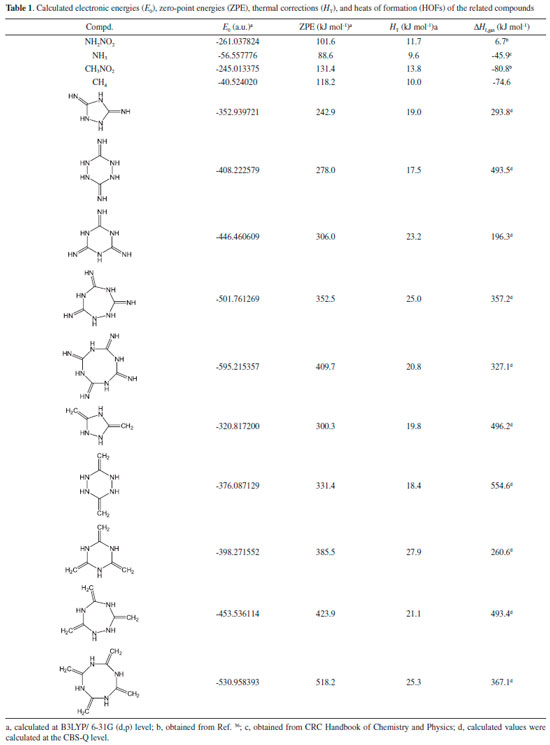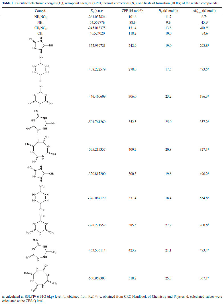 RESULTS AND DISCUSSION Heat of formation Table 1 illustrates the total energies (E0), thermal corrections (HT), zero point energies (ZPEs), and heats of formation (HOFs) of the related compounds that referred in the isodesmic reaction. It is seen that all the designed parent compounds have high positive heats of formation (from 196.3 to 554.6 kJ mol-1) which in turn will make great contribution to the heats of formation of the designed compounds.