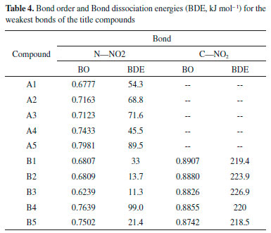Thermal stability Bond dissociation energy (BDE) can provide useful information in thermal decomposition process and stabilities of an energetic material. In general, the smaller is the energy for breaking a bond, the weaker the bond is, and the easier the bond becomes more unstable. On the other hand, a consensus has been reached that nitro groups attached to the ring often represent as the trigger bonds in thermal decomposition process of organic polynitro compounds and thus, the weakest C-NO2 and N-NO2 bonds, which were screened based on bond order (BO), were selected as the breaking bonds for the calculation of the BDEs. Table 4 lists the values of BO and BDE of the designed compounds.