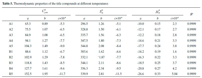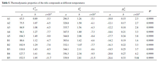 It can be seen from Figure 11 that the positive area was mainly focused on the ring while negative potentials were mostly distributed on the -NO2, =N-NO2 and =C-NO2 groups due to their higher electronegativity. It is to say that nucleophile attack might be easier happened in red areas while the blue areas were the primary electrophilic sites. On the other hand, positive areas on compounds A4,A5, B4 and B5 were more decentralized than compounds A1, A2, A3, B1, B2 and B3. It implies that compounds A1, A2, A3, B1, B2 and B3 will be more stable than compounds A4,A5, B4 and B5 based on the result proposed by Klapotke et al.41 electrostatic potential of positive areas on the molecular surface which were centralized and large enough will make great contribution to improving the stability of a molecule. Besides, the ratio of positive and negative area were also displayed in the figure. It is found that the area ratio of positive ESP appears on compounds A1, A2, A3, B1, B2 and B3 were larger and more centralized than those appear on compounds A4, A5, B4 and B5. Thermal dynamic properties Thermal dynamic parameters such as standard molar heat capacity (Cθp,m) , standard molar entropy (Sθm) and standard molar enthalpy (Hθm) from 200 to 600 K of these designed compounds were investigated based on vibrational analysis. It is found that all the parameters fit well with the equation X =a + bT + cT2 (X=Cθp,m, Sθm and Hθm). The related constants a, b and c were calculated and summarized in Table 5. From the table, it is seen that values of Cθp,m, Sθm and Hθm increased evidently as the temperature increasing. However, the growth rates of Cθp,m and Sθm decreased while growth rate of Hθm improved evidently as the temperature increased. This is because the translations and rotations of chemical bonds were the main influencing factors when the temperature is low while vibrational movement occurred and intensified at a high temperature. It is also found that values of Cθp,m, Sθm and Hθm increase as the number of nitro groups increasing due to the space steric effects and the strong interaction of nitro groups. Oppositely, the energy gaps between HOMO and LUMO decrease as the number of nitro groups increasing which also may be caused by the space steric effects of nitro groups. Take compounds A5 and B5 for example, Cθp,m, Sθm and Hθm of compound B5 were higher than those of compound A5 whereas the energy gap of compound A5 (4.5 eV)was higher than that of B5 (3.81 eV). In other words, it is the strong space steric effects of nitro groups in compound B5 that led to the higher values of Cθp,m, Sθm, Hθm and lower HOMO-LUMO energy gap. All the parameters may provide useful information in state equation, macroscopic properties and chemical reactions of the designed compounds.
