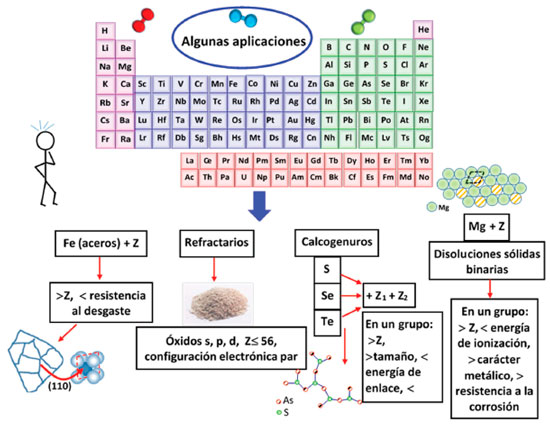 Otros cálculos sobre procesos de fortalecimiento de los límites de grano se comparan con datos experimentales conocidos y se confirman con investigaciones realizadas utilizando las técnicas espectroscópicas de Auger y XPS.17 De esta manera, la compatibilidad de algunos elementos con el hierro (en los límites de grano) y su influencia en el endurecimiento (o ablandamiento) del acero, se relaciona con la ley periódica. Esta dependencia puede ser la base teórica para predecir propiedades de resistencia al desgaste en materiales policristalinos basados en diversas aleaciones de elementos. Por otra parte, con respecto a la optimización de materiales refractarios, Khoroshavin y Shcherbatskii16 describen tratamientos para la producción de estos materiales basados en la "tecnología refractaria electrónica", cuyos conceptos básicos, de acuerdo a sus descripciones, se establecen en la "ley fundamental de la ciencia de los materiales", la ley periódica.16 Esta tecnología se centra en el control de electrones (control de las capas electrónicas en los materiales de partida), durante procesos electroquímicos, termoquímicos y electrotermoquímicos para modificar las propiedades de elementos y compuestos que conforman los materiales refractarios, con el fin de proporcionar mayor resistencia al desgaste durante su vida útil. Varias tendencias, basadas en la ley periódica, son evidenciadas y discutidas en detalle por dichos autores en el contexto de esta tecnología. Por ejemplo, se ha identificado que cerámicos refractarios de alta resistencia al desgaste se preparan mejor utilizando óxidos de elementos pares (configuración electrónica externa finalizada en número par), mientras que los óxidos de elementos impares (configuración electrónica externa finalizada en número impar) se usan mejor como aditivos. De igual manera, los óxidos de elementos s, p y d, hasta el elemento bario (Z= 56), son los más adecuados para producir materiales refractarios.16 De otro lado, los vidrios calcogenuros son sistemas binarios o ternarios amorfos de aleaciones de calcógenos con otros elementos. Como materiales funcionales tienen aplicaciones tecnológicas en imágenes térmicas, visión nocturna, sistemas de liberación de energía láser, detección química, óptica no lineal y microscopía de campo cercano.30 Minaev y Timoshenkov15 describen en detalle cómo la síntesis de estos vidrios calcogenuros se ve influenciada por la periodicidad química e identifican que estos sistemas (aleaciones amorfas) de calcogenuros binarios o ternarios, en general, pueden formarse con todos los elementos de la tabla periódica, excluyendo aquellos pertenecientes a los grupos 2 y 18 y a los períodos primero y séptimo (con algunas excepciones para los sistemas ternarios). En términos de periodicidad, se ha evidenciado claramente que la capacidad de los elementos de los grupos 13, 14, 15 y 16 para formar vidrios calcogenuros (binarios o ternarios) disminuye con el aumento del número atómico a lo largo de dichos grupos, lo que se explica con el incremento del carácter metálico del segundo o tercer elemento incorporado en la aleación y con la consecuente disminución de la energía del enlace químico formado.15 También se ha observado la inversión de dicha tendencia para el caso individual de algunos elementos, lo cual se considera como una manifestación de la periodicidad secundaria en la tabla periódica. Lo anterior es fundamental para el diseño de nuevos materiales amorfos calcogenuros con propiedades físico-químicas mejoradas, que optimicen su desempeño y potencialicen sus aplicaciones. Otro caso importante de la influencia de la periodicidad de los elementos en las propiedades de los materiales lo constituyen los sistemas binarios metálicos (disoluciones sólidas) de magnesio con diferentes elementos de la tabla periódica.31 Dichas aleaciones son de baja densidad y potencial aplicación en la industria aeroespacial. La resistencia a la corrosión de estas aleaciones de magnesio varía regularmente según la posición, en la tabla periódica, del elemento adicionado (aleante), mostrando mayor resistencia a la corrosión con el aumento en el número atómico, la electropositividad (carácter metálico) y solubilidad del elemento adicionado (soluto). Esta tendencia es el resultado de factores electroquímicos, de volumen (tamaño) y de valencia causados con la incorporación del elemento disuelto y permite la predicción de nuevas aleaciones de magnesio con desempeños superiores.31 Evidentemente, la capacidad para formar dichas disoluciones y los efectos mencionados están estrechamente relacionados con las reglas de Hume-Rothery.32 Estas reglas, en general, permiten predecir de manera cualitativa los niveles de solubilidad (substitucional) de elementos tanto en la formación de aleaciones como en la formación de otras estructuras cristalinas como óxidos, sales y demás redes complejas substituidas. Según las reglas de Hume-Rhothery, la diferencia entre los radios de los átomos (o iones) del disolvente (o estructura matriz) y los átomos (o iones) del soluto debe ser menor al 15% para que se favorezca la formación de la solución sólida, es decir para que ocurra la substitución isomórfica. En la medida en que dicha diferencia es menor, la solubilidad tiende a ser máxima. Como reglas adicionales, la electronegatividad y el número de oxidación del soluto deben ser similares a los del disolvente, lo cual favorece la substitución. La similitud entre las estructuras cristalinas del soluto y del disolvente también favorece la formación de la solución sólida substitucional. Si la diferencia de electronegatividades es considerable, entonces las especies involucradas tienden a formar un compuesto y no una solución sólida; y si existe demasiada diferencia entre los números de oxidación, entonces se genera un desbalance electrostático que llega a ocasionar un número elevado de 