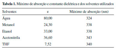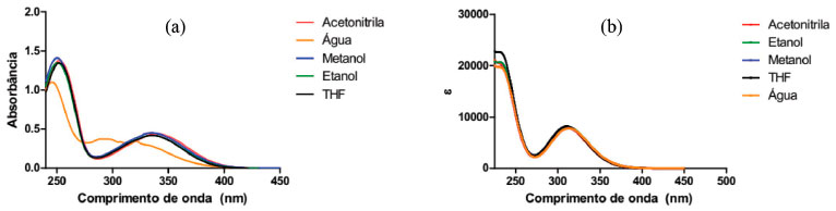 ![]() Figura 3. (a) Espectros de absorçao experimental da DanG, 100 µmol L-1 em diversos solventes: água; metanol; etanol; acetonitrila e THF (b) Espectros de absorçao teórico da DanG nos mesmos solventes
