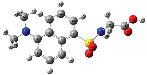 PARTE EXPERIMENTAL Produtos químicos Dansilglicina (DanG - C14H16N2O4S), Albumina do Soro Humano, livre de ácidos graxos e de globulinas, 99% (HSA), Fosfato dibásico de sódio (Na2HPO4), Fosfato monobásico de sódio 99% (NaH2PO4), Acetonitrila 99,8% (C2H3N), Tetrahidrofurano 99,5% (THF, C4H8O), Metanol 99,9% (CH3OH), foram fornecidos pela Sigma Aldrich Chemical Co. (St. Louis, MO, EUA). Alcool etílico 99,66% (C2H6O) fornecido pela J. T Baker Chemical Company (Phillipsburg, New Jersey). A soluçao estoque de HSA 1 mmol L-1 foi preparada dissolvendo-se a massa de 0,066 g de HSA em 1,0 mL de tampao fosfato de sódio 0,05 mol L-1, pH 7,0. 60,0 µL dessa soluçao foram diluídas para 2,0 mL, gerando uma concentraçao final de 30,0 µmol L-1, a qual foi submetida às análises. Para o preparo de 1,0 mL da dansilglicina (DanG) 10 mmol L-1 (Massa Molar = 308,35 g mol-1), foi pesado 0,00323 g de DanG e dissolvido em 1 mL de álcool etílico. A partir desta fizeram-se as diluiçoes necessárias em água, metanol, etanol, acetonitrila e THF. A soluçao estoque foi mantida na geladeira e a soluçao de trabalho foi descartada após a mediçao. A concentraçao da soluçao estoque de HSA (1 mmol L-1), preparada em tampao fosfato 50 mmol L-1, pH 7,0, foi determinada por sua absorbância na regiao do UV-Vis (HSA, ε280 nm = 35.219 mol-1 L cm-1). Espectroscopia UV-Vis As medidas foram realizadas num espectrofotômetro UV-Vis Lambda 35 (Perkin Elmer, Shelton, CT, USA). O equipamento foi ajustado para determinar o espectro de absorbância no intervalo de 250-450 nm. O volume da soluçao, do aminoácido DanG, (100 µmol L-1) foi mantido fixo num valor de 10,0 µL adicionado em cada solvente num volume fixo de 990,0 µL, apresentando um volume final igual a 1.000,0 µL. Antes de cada análise as amostras e a placa transparente com as amostras foram incubadas a temperatura ambiente por 5 minutos. Elipticidade : dicroísmo circular eletrônico (ECD) Os estudos de ECD foram realizados em um espectropolarímetro Jasco J-815 (Jasco, Japan) equipado com controle termostatizado e agitaçao magnética no compartimento da amostra. Todas as medidas foram corrigidas para a absorçao do tampao fosfato 0,05 mol L-1, pH 7.0. Para os estudos na regiao do Ultra-Violeta próximo, foi utilizado um espectropolarímetro Jasco J-815 (Jasco, Japan). As medidas foram realizadas em uma cubeta de quartzo de 3 mL com 10 mm de caminho óptico, numa concentraçao de 30 µmol L-1 da proteína HSA e 30 µmol L-1 do aminoácido DG. Os estudos foram feitos em tampao fosfato 0,05 M, pH 7.0, à temperatura de 25 °C. Os espectros foram obtidos na faixa de comprimento de onda entre 250-500 nm, com uma largura de banda de 1 nm, com um tempo de resposta 1 s, e tempo de varredura de 50 nm/min. Metodologia computacional Teoria do Funcional da Densidade As conformaçoes do aminoácido DanG em fase gasosa e nos solventes água, etanol, metanol, acetonitrila e THF foram calculadas ao nível DFT utilizando os funcionais híbridos B3LYP e CAM-B3LYP com o conjunto de funçoes de base 6-311++G(2d,p), usando o programa Gaussian0928 e as facilidades computacionais do GridUNESP. No cálculo dos espectros teóricos de ECD e de absorçao UV-Vis foram utilizados os seguintes parâmetros no programa Gaussian 09: TD(FULL,SINGLET,NSTATES=15) SCRF(SMD, SOLVENT). As estruturas otimizadas nao apresentaram frequências imaginárias, nao sendo, portanto, estados intermediários; foi utilizado: CAM B3LYP/6 311++G(2d,p) Opt Freq. A visualizaçao e interpretaçao dos resultados foram feitas através do software GAUSSVIEWS 5.0.29 Docking molecular O docking foi realizado utilizando as seguintes estruturas cristalográficas obtidas do banco de dados "Protein Data Bank" (PDB): 2xvu30 e 2xw130 com resoluçao de 2,6 e 2,5 Å, respectivamente. Estas estruturas sao complexos cristalográficos: (a) 2xvu é uma HSA livre de ácidos graxos complexada com dansil-L-asparagina (DanN) em dois sítios, onde estao presentes os resíduos de aminoácidos W214 (sítio I) e Y411 (sítio II); (b) 2xvu é uma HSA livre de ácidos graxos complexada com dansil-L-norvalina (DanNV) em um único sítio, onde está presente o resíduo de aminoácido Y411 (sítio II). Os cálculos de docking molecular foram realizados utilizando o software computacional baseado em algoritmos genéticos GOLD (CCDC)31-33 v.5.6.2 e foi utilizada a funçao de ajuste GoldScore apresenta a seguir: ![]() em que S(hb_ext) é a energia das ligaçoes de hidrogênio proteína-ligante, S(vdw_ext) é a energia das interaçoes de van der Waals proteína-ligante, e S(int) é uma penalidade para nao incentivar as interaçoes internas do ligante. Os cálculos de docking foram realizados de maneira similar nos dois casos: