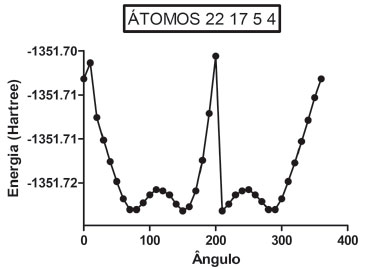 A SEP da DanG foi calculada a partir do funcional híbrido B3LYP e a funçao de base 6-31G(2d, p) no vácuo. Na Figura 6 apresentamos a SEP (com intervalos de 10° entre cada ponto da curva desde 0° até 360°), na qual podemos verificar a presença de mínimos e máximos de energia como uma funçao do ângulo diedro representado pelos átomos: C22-N17-C5-C4. A SEP foi calculada de maneira nao rígida, isso é, para cada valor do ângulo diedro a estrutura da molécula inteira foi otimizada.