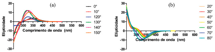 Apresentamos na Figura 7 (a) o espectro da DanG no solvente água para os ângulos diedros de 0°, 10°, 120°, 130°, 140° e 150° onde podemos verificar que o sinal de ECD obtido foi positivo para todos os ângulos diedros considerados. Para o ângulo de 0° o máximo no espectro de ECD encontra-se em 350 nm, e à medida que aumentamos o ângulo diedro este máximo sofre um descolamento para comprimentos de onda menores: para o ângulo de 130° o valor máximo é igual a 310 nm e à medida que aumentamos o diedro o ângulo para 140° e 150° o valor máximo passa a ser igual 315 e 320 nm, respectivamente. Na Figura 7(b) apresentamos o espectro da DanG no solvente água para os ângulos diedros de 20°, 30°, 40°, 50°, 60°, 70° e 80°, a partir da qual podemos verificar que o sinal de ECD obtido foi negativo para todos os ângulos diedros considerados. A medida que aumentamos o valor do ângulo diedro no intervalo de 20° a 60°, o sinal de ECD nao sofre mudanças significativas situando-se próximo a 350 nm. A medida que aumentos o valor do ângulo diedro para 70° e 80°, foi observado um aumento na intensidade do sinal e um deslocamento hipsocrômico, com máximos de elipcitidade iguais a 326 e 317 nm, respectivamente.