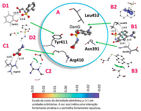 A análise das interaçoes realizada com o programa de visualizaçao gráfica36 indica que o grupo naftil da molécula se estabiliza pelas interaçoes do tipo p entre os aminoácidos Asn391 e Leu453, conforme pode ser obervado na Figura 9. O grupo carboxílico da DanG faz ligaçoes de hidrogênio com Arg410 e o grupo sulfona faz interaçoes com a Tyr411.