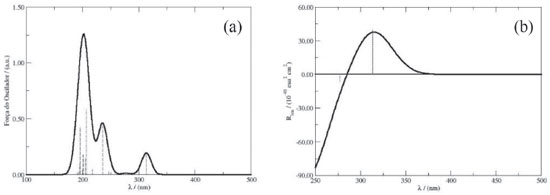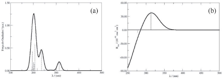 A partir da configuraçao obtida para a molécula de DanG nos cálculos de docking molecular, obtivemos os espectros de UV-Vis e de ECD da molécula de DanG a partir da simulaçao computacional utilizando o funcional CAM-B3LYP e a funçao de base 6-311++G(3df,2p). Na Figura 10 apresentamos os especros de UV-Vis (a) e ECD (b) representados como a força do oscilador e o poder rotatório, respectivamente. Podemos observar que ocorre uma boa concordancia entre os resultados do docking molecular e aqueles obtidos através da técnica DFT e dos resultados experimentais.