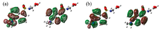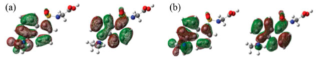 ![]() Figura 11. Principais orbitais moleculares (a) HOMO e LUMO da DanG para o diedro de 80º (b) HOMO e LUMO da DG para o diedro de 150º