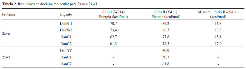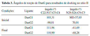 Os dados apresentados na Tabela 2 mostram que, para o caso em que o receptor é a proteína 2xw1, em que apenas o sítio II está ocupado pelo ligante, o escore do redocking (reconstruçao do complexo cristalográfico) e os de DanG sao muito próximos, indicando que o ligante DanG pode se acomodar neste sítio assim como o ligante cristalográfico. Para o receptor de 2xvu, oberva-se que os cálculos de redocking indicam uma preferência pelo sítio II, sugerindo que este sítio é o preferencial. Os ângulos de torsao das moléculas sao apresentados na Tabela 3.