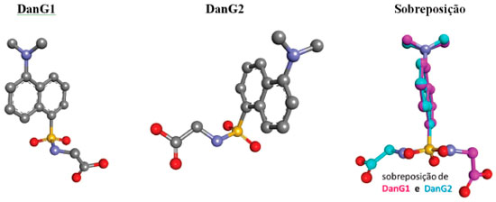 De acordo com os resultados apresentados na Tabela 3, podemos observar que apesar das moléculas ligantes DanG terem condiçoes iniciais diferentes, a condiçao final, obtida com o docking molecular á praticamente a mesma. Na Figura 8 apresentamos o ligante DanG no sítio II da proteína HSA em uma representaçao de superfície para a proteína, a partir da qual podemos observar que o grupo naftil ocupa o bolso interno da proteína e o grupo carboxílico está voltado para o solvente.