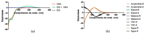 ![]() Figura 4. (a) Complexaçao da DanG-HSA (b) ECD da DanG em diferentes solventes e suas configuraçoes R e S