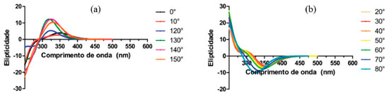 ![]() Figura 7. Espectros de dicroismo circular (a) positivo e (b) negativo da DanG no solvente água em funçao dos ângulos diedros