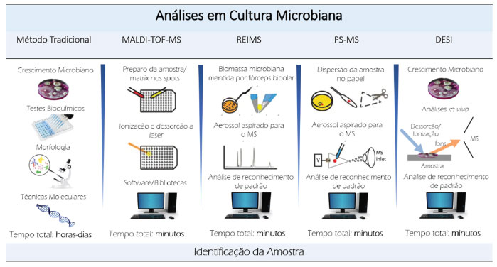 Figura 2. Fluxos de trabalho para identificaçao microbiana. Método tradicional; Ionizaçao e dessorçao a laser assistido por matriz (MALDI) espectrometria de massas (MS) por tempo de voo (TOF); Espectrometria de massas com ionizaçao evaporativa rápida (REIMS); Espectrometria de massas por pulverizaçao em papel (PS-MS); Ionizaçao de Dessorçao por Electrospray (DESI). Extraído de Luzzatto-Knaan et al. 2015.121 Copyright 2015, com autorizaçao da revista Analyst