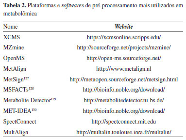 O principal objetivo da filtragem de ruído é separar o sinal proveniente de um composto na amostra biológica de um sinal de fundo proveniente de interferência química ou instrumental, facilitando a etapa de detecçao de picos125,126 A detecçao de pico/deconvoluçao compreende a identificaçao da forma correta de um sinal que potencialmente é de um composto, ou seja, detecta cada íon medido em uma amostra e atribui a um sinal cromatográfico (par m/z-RT (do inglês, retention time).123,124 O objetivo da detecçao e deconvoluçao de pico é identificar e quantificar os sinais correspondentes às moléculas nas amostras; assim, um método de detecçao de pico eficiente deve identificar os sinais verdadeiros e evitar falsos positivos. Além disso, a detecçao de picos e a deconvoluçao reduzem a complexidade dos dados e tornam a posterior análise viável.126 Outra etapa de extrema importância no pré-processamento de dados cromatográficos é o alinhamento dos picos entre as amostras. De forma resumida, o algoritmo de alinhamento visa corrigir oscilaçoes aleatórias de tempo de retençao de um mesmo pico entre diferentes amostras.124 Já o algoritmo de preenchimento de lacunas é utilizado para recuperar os sinais que podem ter sido eliminados nas etapas anteriores de pré-processamento a partir dos dados brutos.126 A normalizaçao é o processo que visa corrigir a variaçao sistemática e escalar os dados para que diferentes amostras em um estudo possam ser comparadas entre si, sendo assim, é aplicado dividindo cada linha de tabela de dados por um fator de normalizaçao.4 Duas estratégias principais sao comumente usadas para remover o viés sistemático indesejado nas medidas. A primeira é o uso de padroes internos, no qual a seleçao desses padroes pode ser baseada em regioes específicas de RT ou m/z, mas RT e m/z, contudo, nem sempre sao descritivos de todas as propriedades matriciais e químicas levando a obscurecer a variaçao de dados.126 Outra estratégia sofisticada para a normalizaçao é o uso de amostras de controle de qualidade (QC, do inglês Quality Control) em cada procedimento de aquisiçao de dados a fim de visualizar a variabilidade global de um sistema de mediçao. As amostras de QC referem-se à mistura de volumes iguais de todas as amostras envolvidas no estudo (todos os grupos avaliados).15 Assim, as amostras estudadas sao comparadas com QCs para avaliar sua reprodutibilidade, desempenho e estabilidade instrumental.4,15 As funçoes descritas anteriormente na etapa de pré-processamento sao desempenhadas automaticamente com o auxílio de diferentes softwares e plataformas online e, por isso, um grande volume de novas ferramentas vem sendo desenvolvido nos últimos anos.5,125 Contudo, é importante salientar que a etapa de pré-processamento de dados automático e eficaz continua a ser uma tarefa difícil, especialmente para a detecçao, alinhamento e deconvoluçao de picos de baixa intensidade.4 Algumas das principais plataformas/softwares empregadas no pré-processamento de dados metabolômicos foram compiladas na Tabela 2, sendo em seguida apresentadas algumas aplicaçoes para micro-organismos quando existentes. A maioria dessas ferramentas apresentadas está disponível gratuitamente e podem ser empregadas para dados de LC-MS e GC-MS.