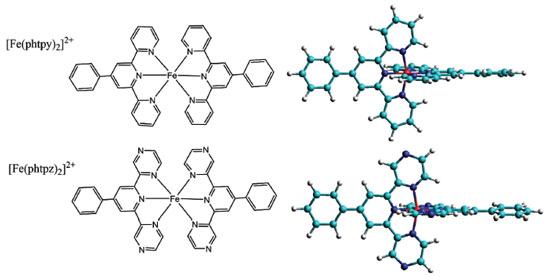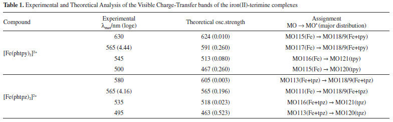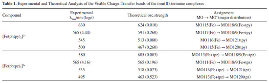 RESULTS AND DISCUSSION The [Fe(phtpy)2]2+ and [Fe(phtpz)2]2+ complexes exhibit a typical low spin configuration, with a peculiar symmetry, where the ligands adopt a local C2v point group, but yielding a global D2d symmetry because of their orthogonal configuration, as illustrated in Figure 1. It should be noted that the four pyrazine ligands are located at orthogonal positions, and are available for interacting with metal complexes, allowing the generation of polynuclear coordination compounds. Electronic Spectra of the [Fe(phtpy)2]2+ and [Fe(phtpz)2]2+ complexes The electronic spectra of the [Fe(phtpy)2]2+ and [Fe(phtpz)2]2+ complexes consist of two sets of bands: one set below 400 nm, associated with internal π→π* transitions in the organic ligand, and another set in the range of 400-700 nm, which is characteristic of the Fe(II)-terimine chromophore, being ascribed to iron(II)-phtpy or iron(II)-phtpz charge-transfer (CT) transitions (Figure 2).
