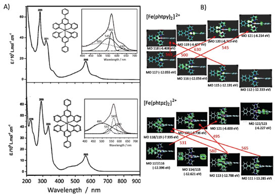 ![]() Figure 2. (A) Electronic spectra of the [Fe(phtpy)2]2+ and [Fe(phtpz)2]2+ complexes in the UV-visible region, showing the spectral deconvolution in the inset, and (B) the relevant HOMO and LUMO levels associated with the respective charge-transfer bands